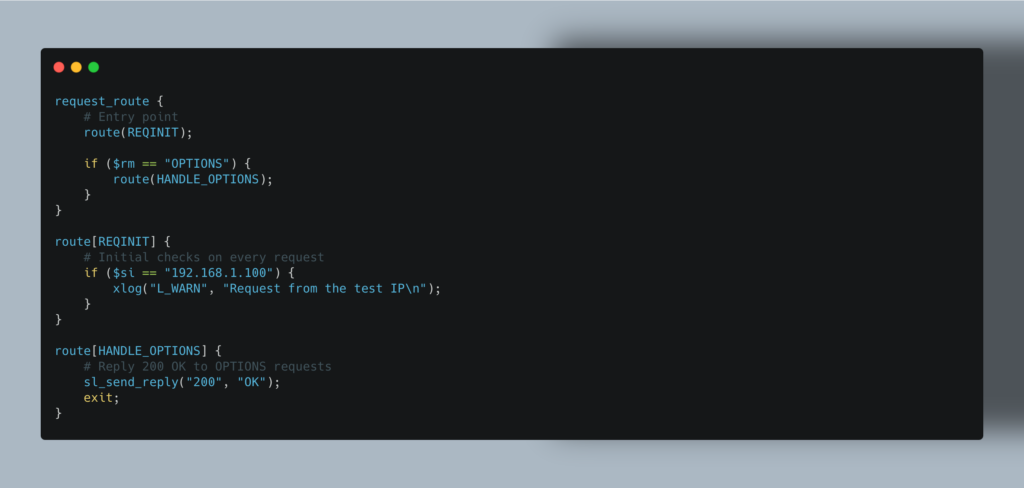 Kamailio’s default configuration extensively uses named routes to organize its logic: REQINIT for initial sanity checks, WITHINDLG for requests inside an existing dialogue, REGISTRAR for registration, LOCATION for locating the callee, RELAY to relay messages, etc.